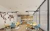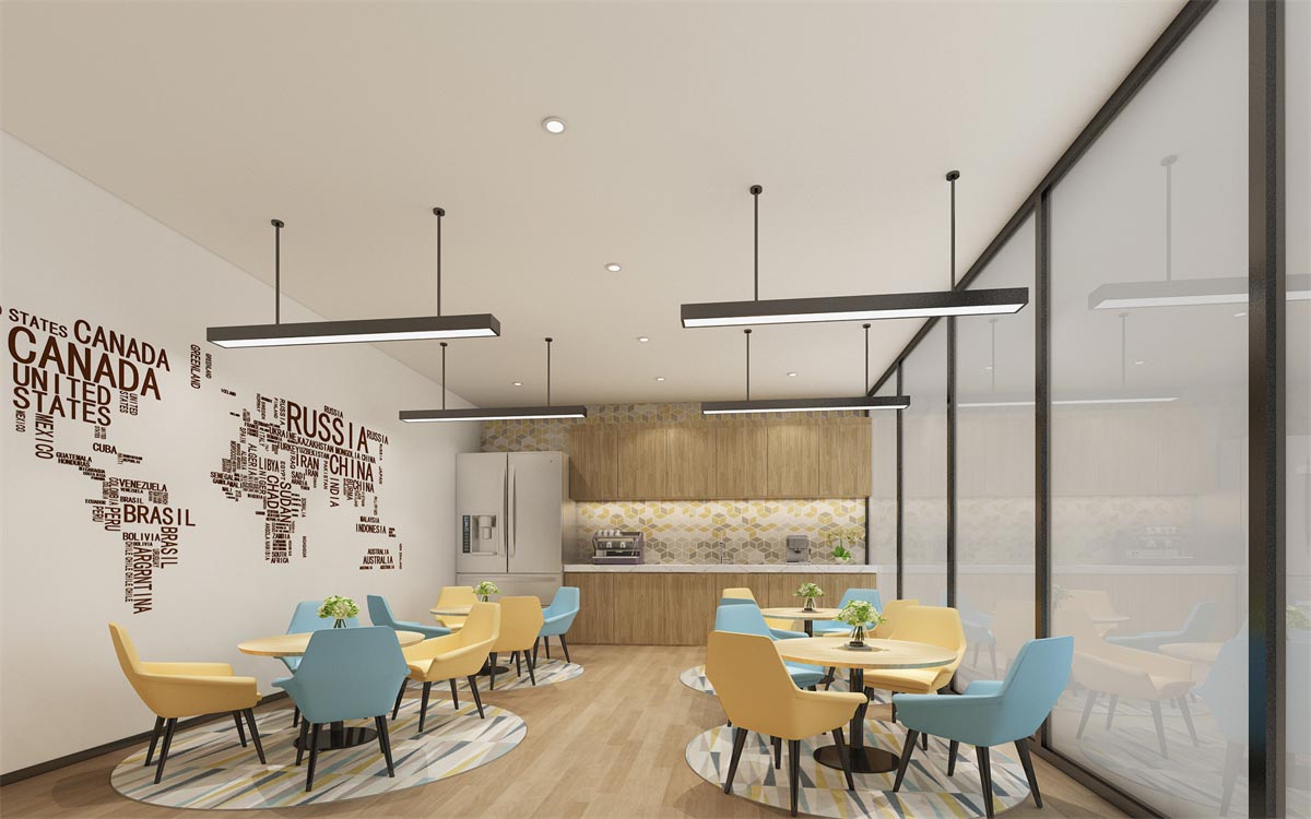休閑區(qū)相對(duì)前面的辦公區(qū)和獨(dú)立辦公室,在裝修方面則顯得更加跳躍活潑,桌椅用活躍的黃色和舒心的青色,搭配綠色的盆栽,讓員工在工作之余可以從視覺(jué)到身心上都得到放松。